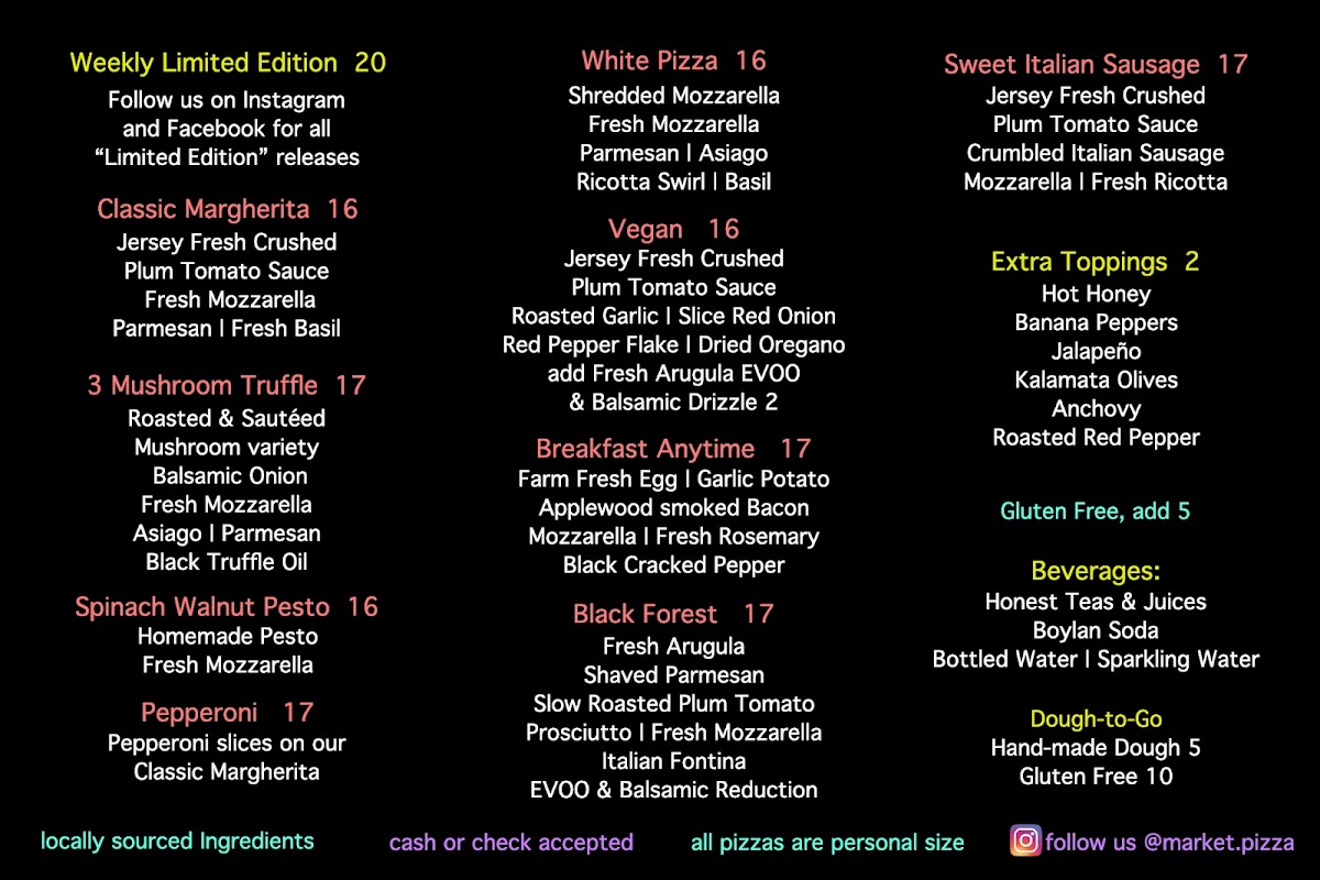 From a reviewer’s perspective, the menu at Market Pizza delivers a creative yet approachable selection that highlights both classic and inventive pies. Standout options like the Pizza Witch Special set the tone for a menu that isn’t afraid to experiment, while offerings such as the Spinach & Walnut Pesto Pizza and Mushroom Truffle Pizza bring a more refined, gourmet touch with rich, layered flavors. For those seeking something unconventional, the Breakfast Any Time Pizza adds a playful twist, making it a memorable choice any hour of the day. Meanwhile, the Black Forest Pizza introduces a unique combination that sparks curiosity, and the ever-reliable Margherita Pizza provides a simple, balanced option that lets quality ingredients shine. Overall, the menu feels thoughtfully curated, blending comfort with creativity, even though pricing details aren’t prominently highlighted.